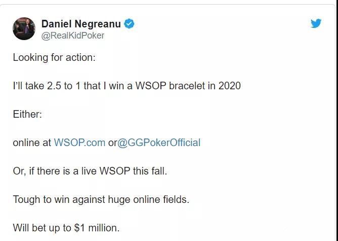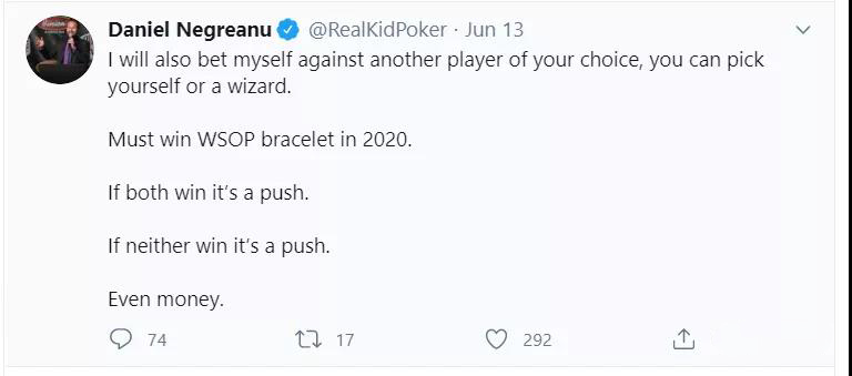 Negreanu说他7月1日到31日将留在美国打WSOP.com的比赛,8月1号之后,他会飞去墨西哥参加GGpoker上的赛事。如果秋季现场赛事最终无法进行,他会有85场线上比赛的机会完成自己的赌约。今年的比赛上线之后,由于不用长途旅行参加比赛,可能会有比往年更多的玩家参赛,夺冠的难度也会变得更大。小编并不看好他能在今年实现自己的愿望,有没有朋友有兴趣和他对赌,我们一起报名吧。